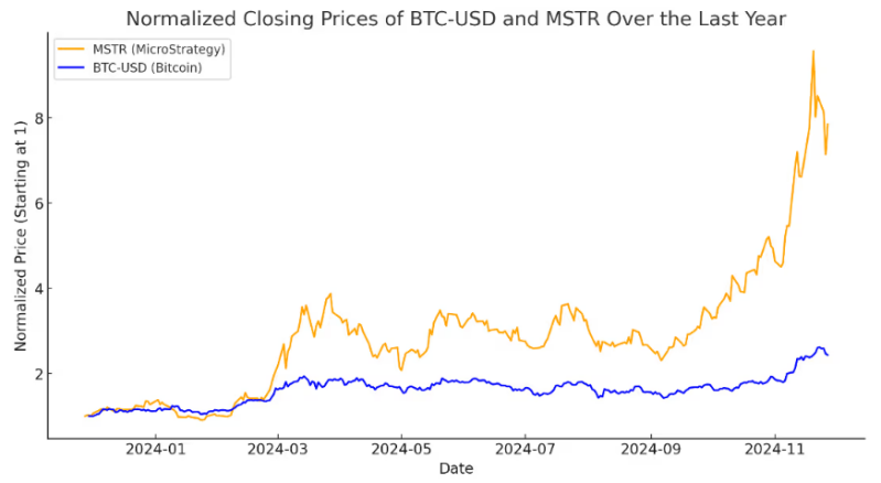 MicroStrategy's normalized returns amplify Bitcoin's due to the high degreee of leverage.